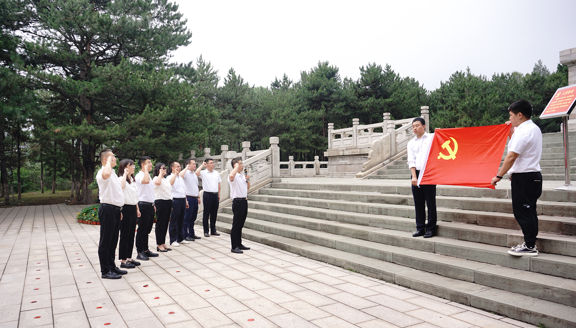 在庄严肃穆的烈士陵园中,党员代表为革命烈士敬献花篮,全体人员鞠躬默哀,举起右手重温入党誓词,牢记入党初心。